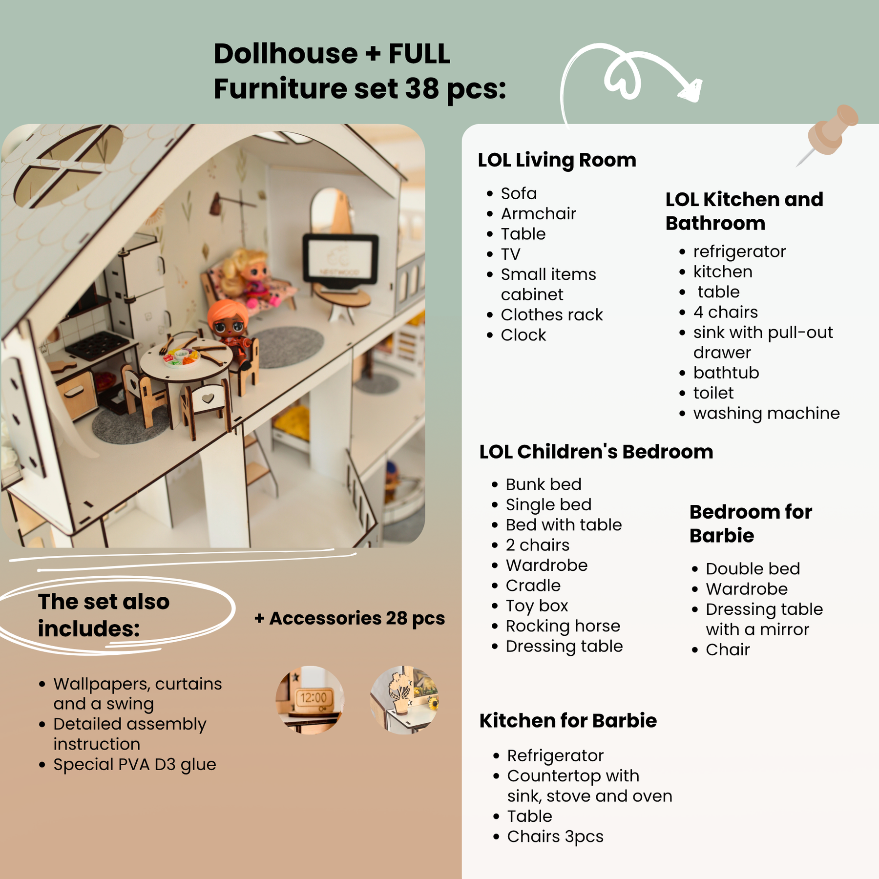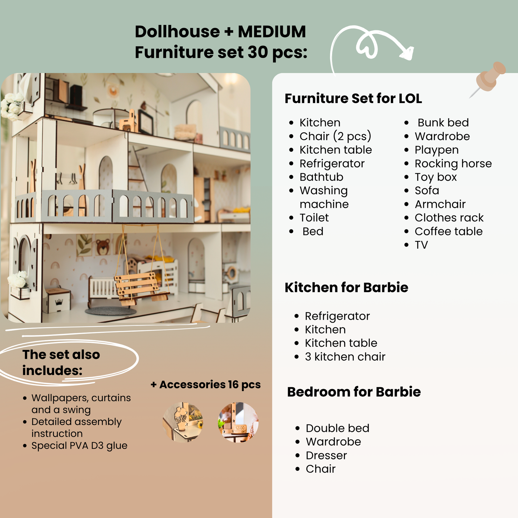 3️⃣ Dollhouse + MEDIUM Furniture Set (30 pcs) – Barbie & LOL Collection: