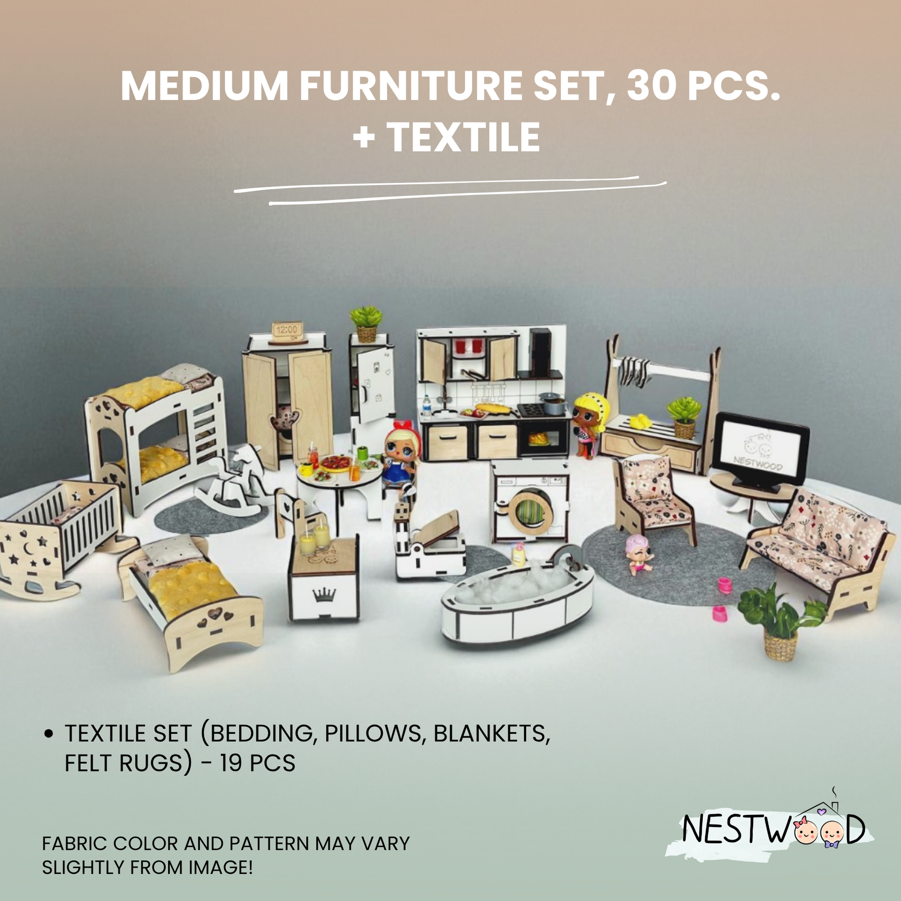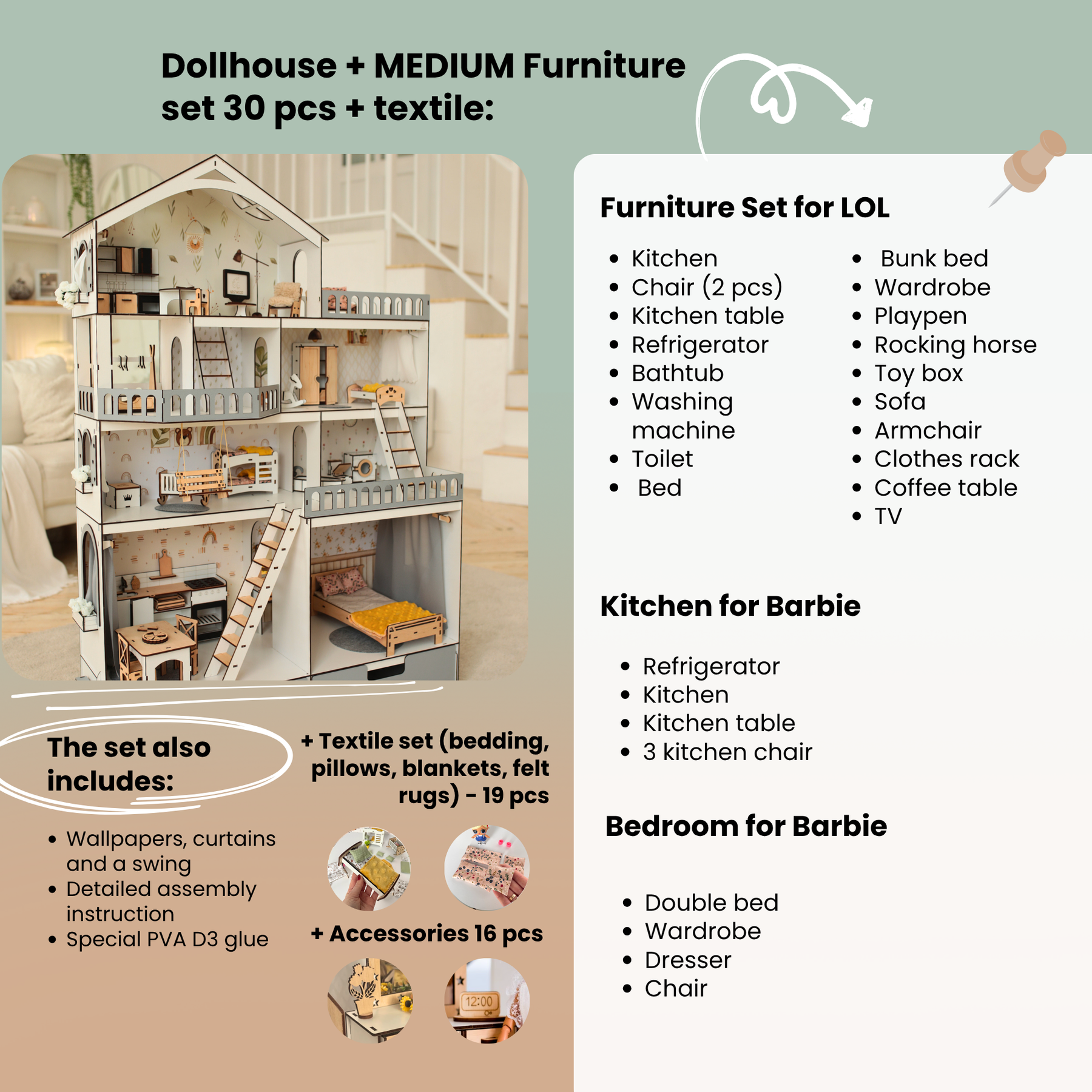 4️⃣ Dollhouse + MEDIUM Furniture Set (30 pcs) + Bedding
