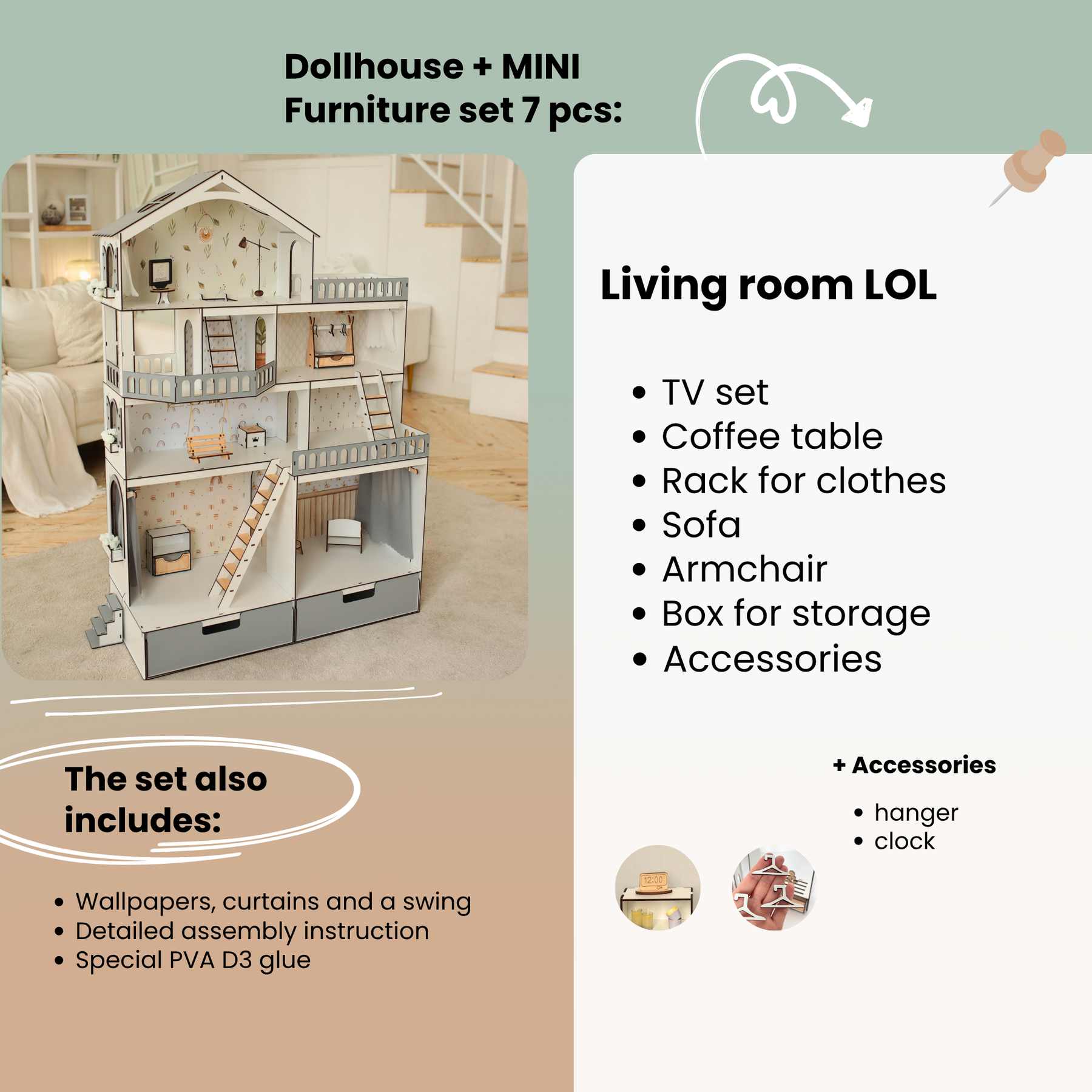 2️⃣ Dollhouse + MINI Furniture Set (7 pcs) – Living Room: