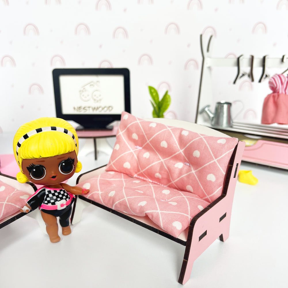 Wir präsentieren unsere umweltfreundlichen Puppenhaus-Miniaturen: Wohnzimmer-Set! Dieses nachhaltige Möbelset ist perfekt für LoL-Puppen und andere kleine Puppen bis zu einer Größe von 12 cm. Es besteht aus umweltfreundlichem HDF (gepresstes ökologisches Holz) und Sperrholz unter Verwendung kindersicherer Farben auf Wasserbasis. Das Set umfasst ein Sofa, einen Sessel, einen Tisch, einen Fernseher, einen Schrank für Kleinteile und einen Kleiderständer mit Kleiderbügeln und einer Schublade. Bereichern Sie die Spielzeit Ihres Kindes mit diesem charmanten, umweltbewussten Wohnzimmer-Set, das seiner Miniaturwelt eine entzückende und gemütliche Note verleiht.