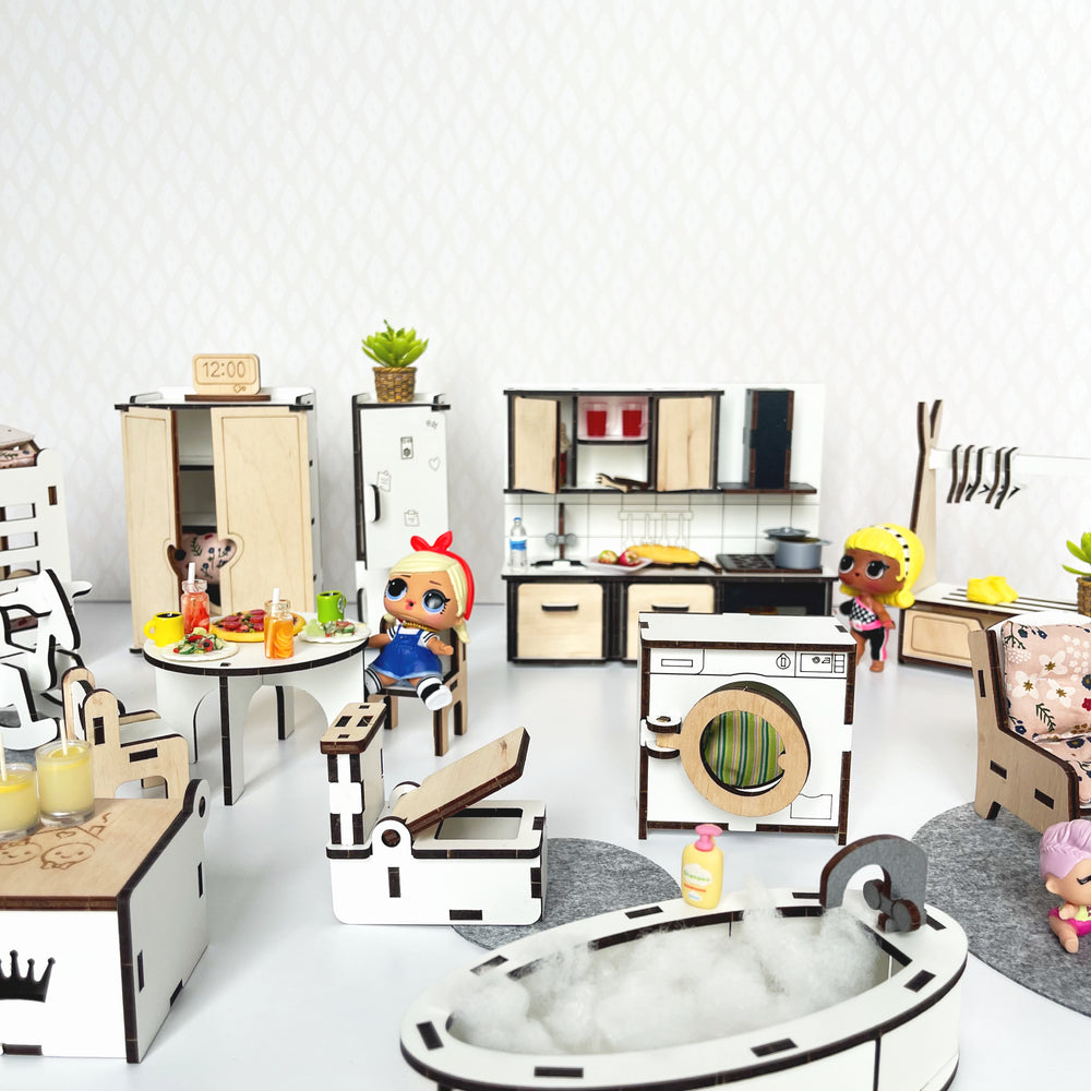 Wichtig! Die Puppenhausmöbel werden unmontiert in einer Schachtel geliefert und wie ein 3D-Puzzle zusammengesetzt. Es ist wichtig, die Puzzleverbindungen mit dem mitgelieferten speziellen D3-PVA-Kleber zu verkleben, um zusätzliche Festigkeit zu gewährleisten.