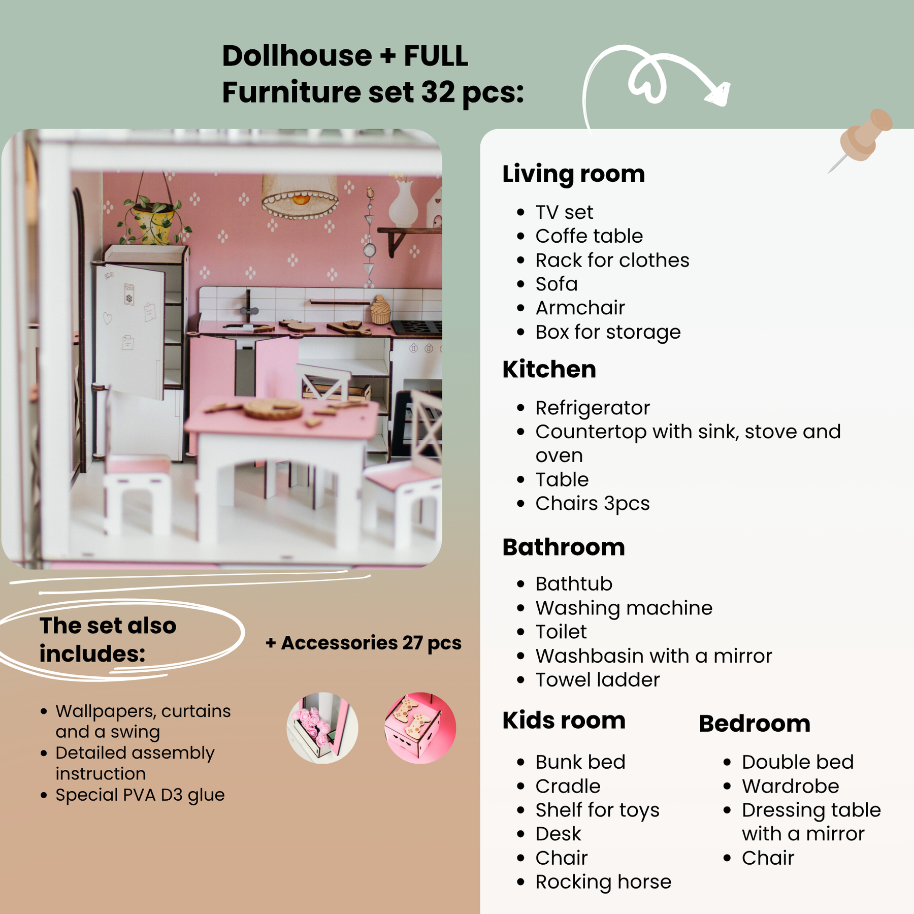 4️⃣ Puppenhaus + KOMPLETTES Möbelset (32 Teile) – Komplettes Spielset: