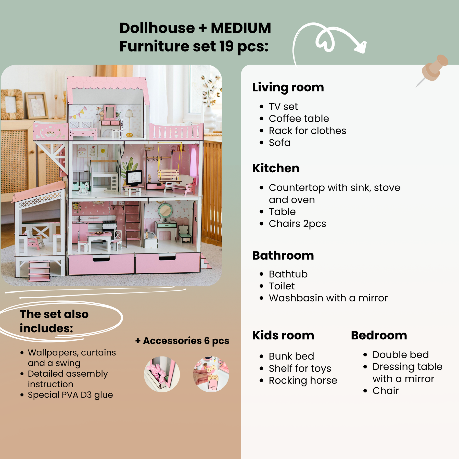 3️⃣ Puppenhaus + MITTLERE Möbelgarnitur (18-teilig) – Komplettes Heimset: