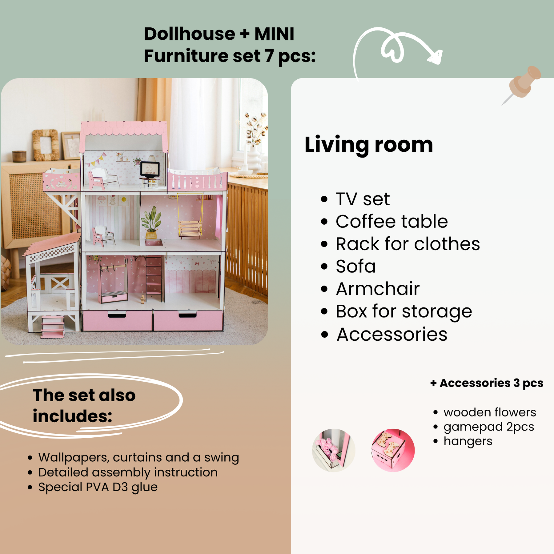 2️⃣ Puppenhaus + MINI-Möbelset (7-teilig) – Wohnzimmer:
