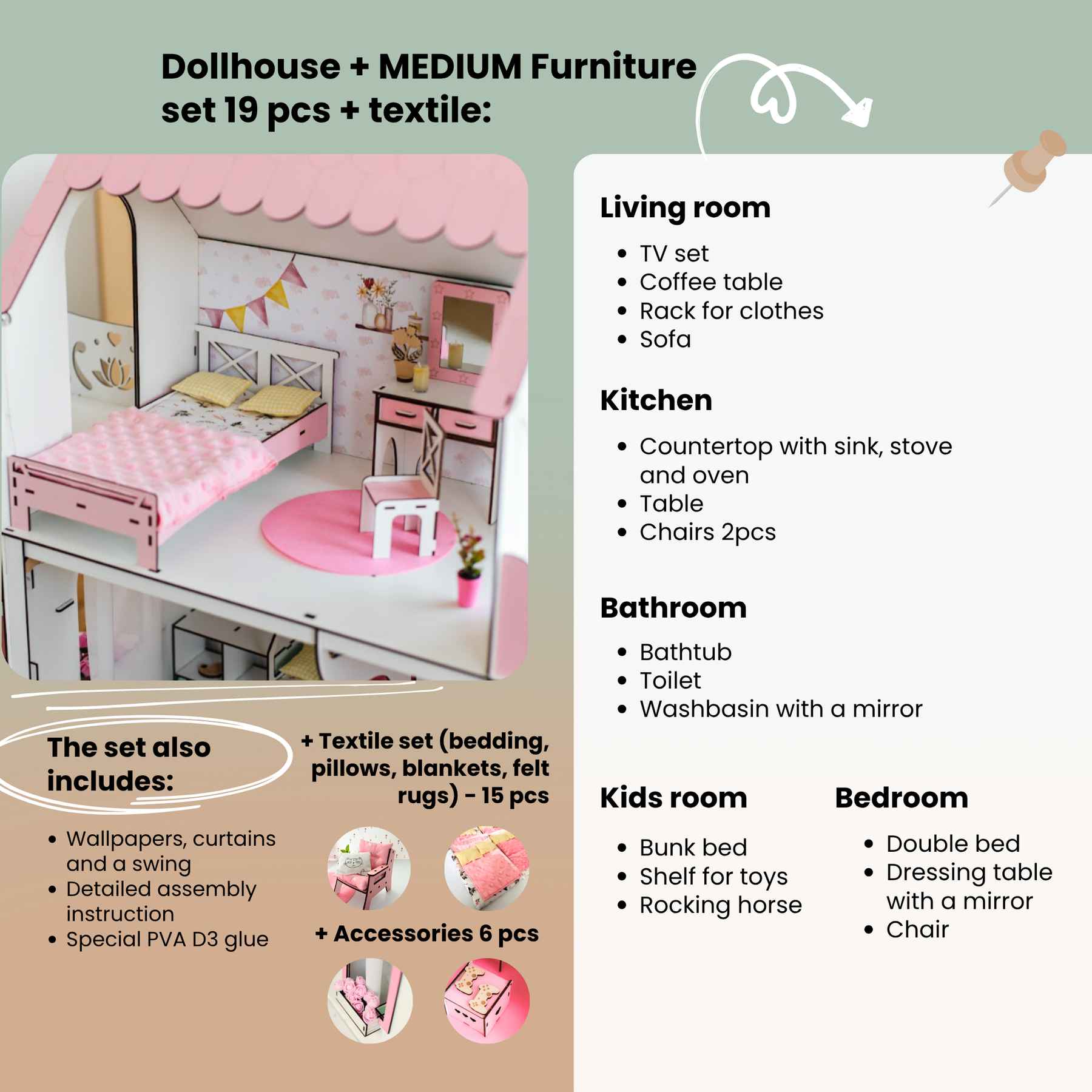3️⃣ Puppenhaus + KOMPLETTES Möbelset (15 Teile) – Komplettes Spielset: