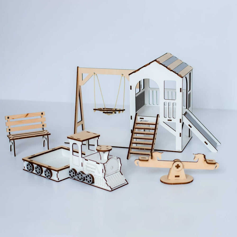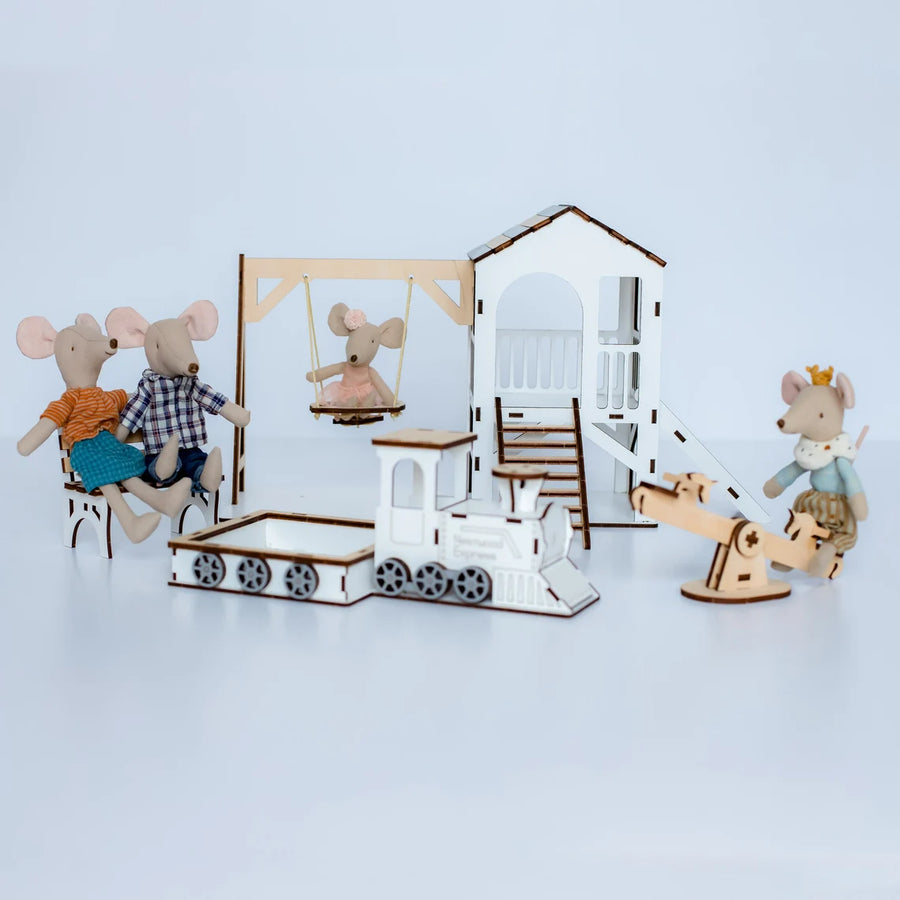 Ihre Puppen werden großen Spaß daran haben, die Rutsche hochzuklettern und mit dem Wind nach unten zu rutschen, auf der Schaukel zu schaukeln oder ruhigere Spiele im Sandkasten in Form eines Zuges zu spielen.