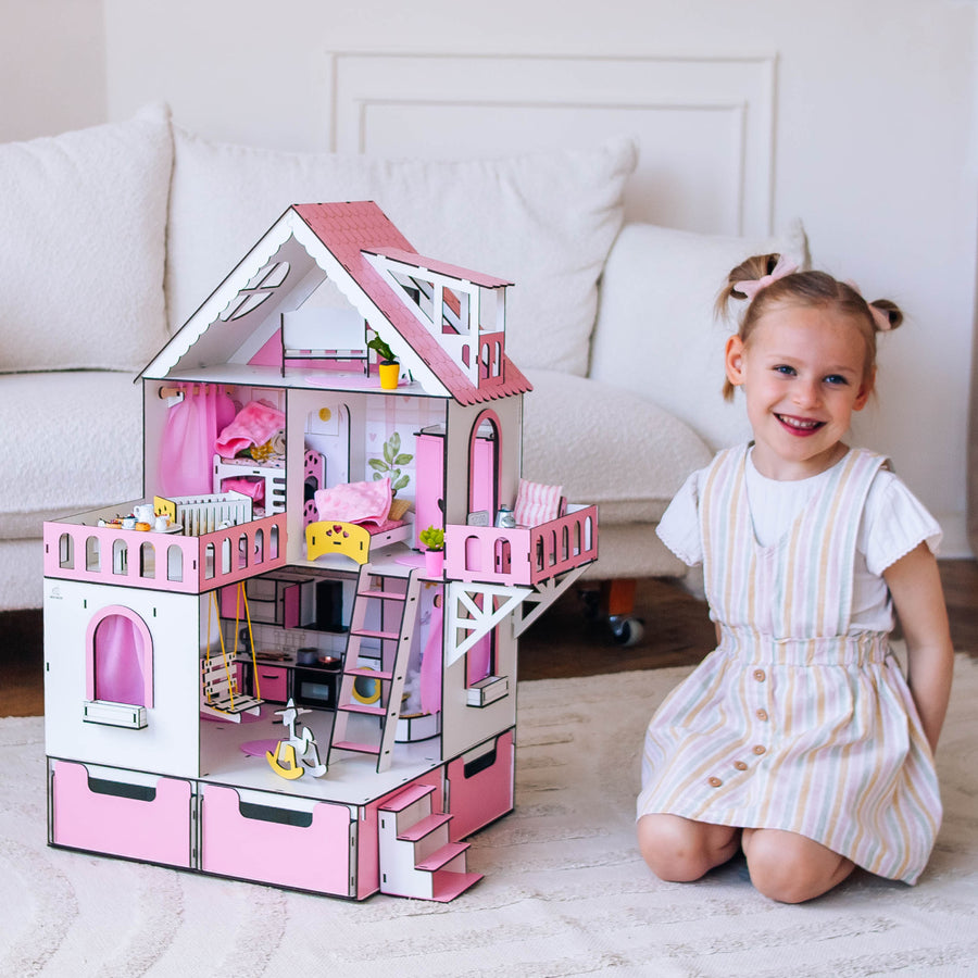 Dieses charmante Cottage mit drei Stockwerken und fünf gemütlichen Zimmern verfügt über Designertapeten, Treppen zwischen den Stockwerken und eine entzückende Schaukel und schafft so ein realistisches Spielerlebnis für Barbie, LOL und andere Puppen.